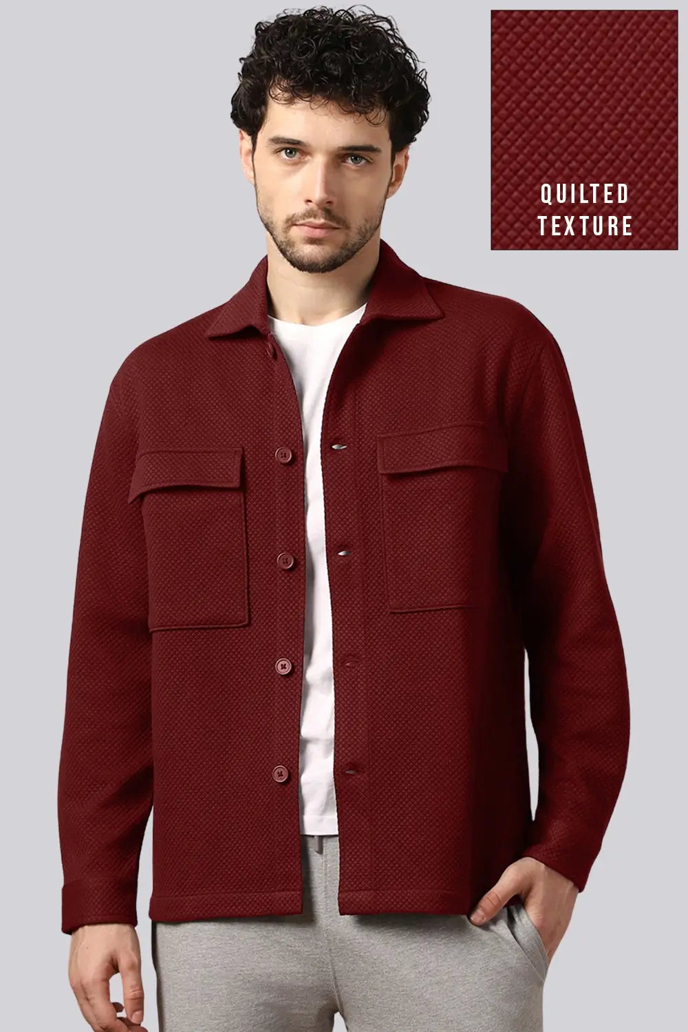 Styling: Complete your winter lookbook by pairing this cozy textured shacket with a trendy Nobero jogger and dainty accessories.